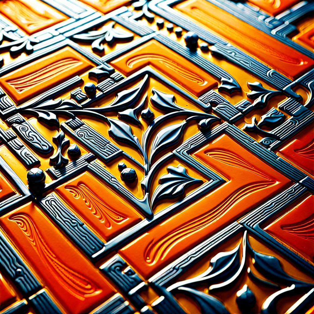 Explore an Art Nouveau tile's intricate design, blending nature and mythology. Vibrant reds, whites, and golds create a captivating, harmonious masterpiece.